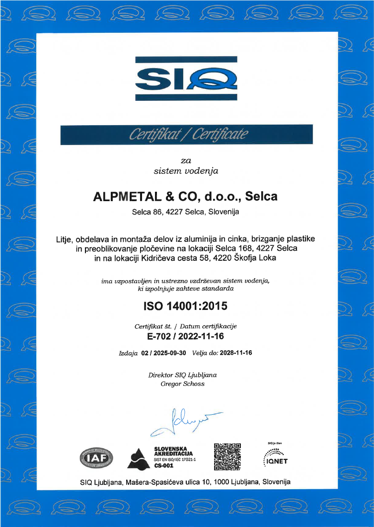 Vodstvo in zaposleni v podjetju ALPMETAL & CO d.o.o. uporabljamo sprejeto politiko kakovosti kot način izboljševanja sistema vodenja kakovosti. Zavezujemo se, da bomo delovali skladno z zahtevami standarda IATF 16949.